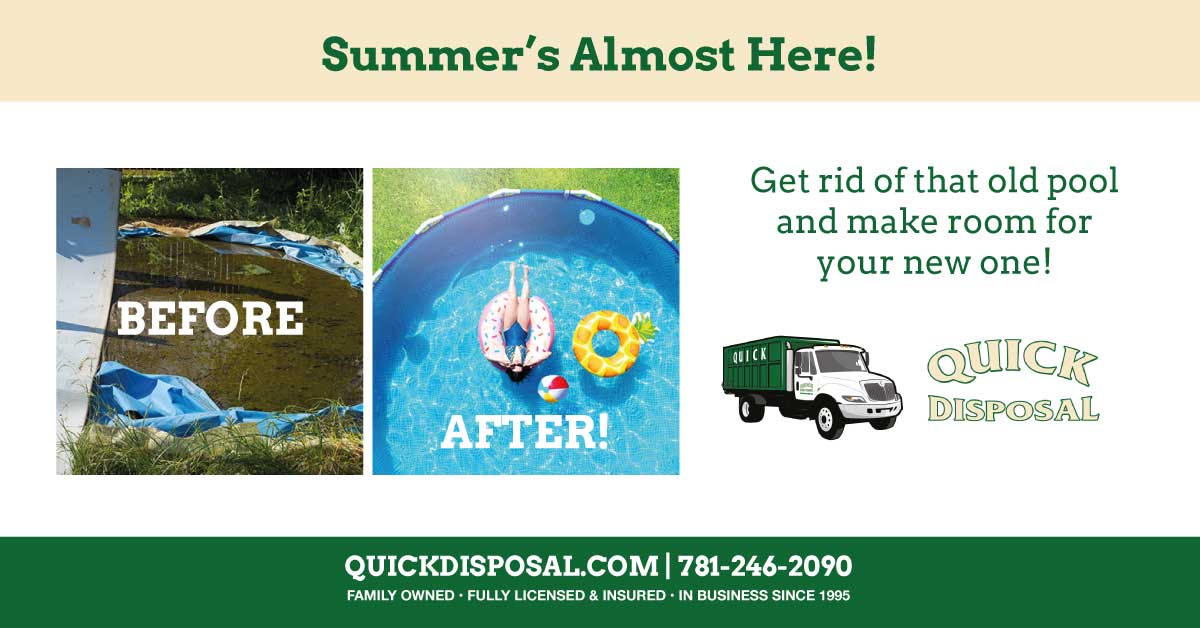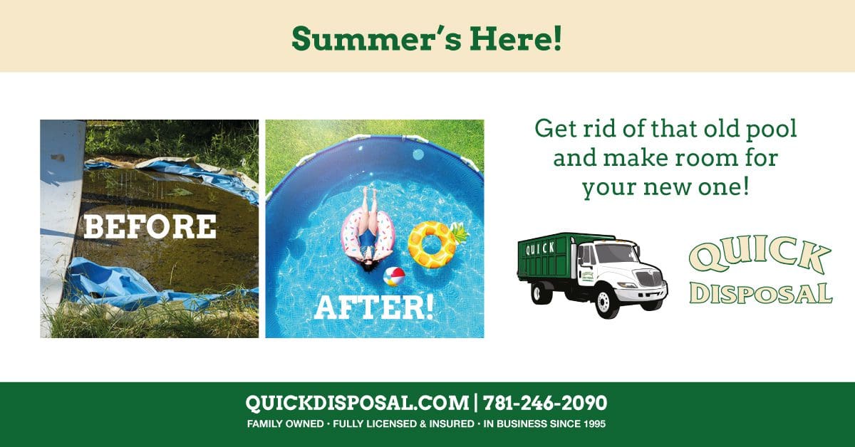 Quick Disposal can provide fast quotes for above-ground pool removal. Give us a call today at (781) 246-2090 and we’ll be ready to haul away your old pool (and any other back yard debris) so you can have your backyard in shipshape during our summer heat waves! #quickdisposal #pooldisposal #poolremoval #oldpool #dumpsterrental #summerprojects #heatwave
