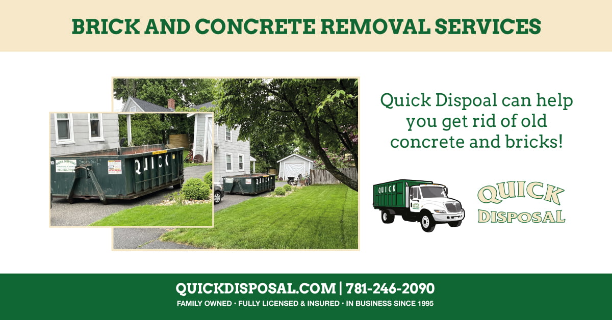 Quick Disposal is here for all of your concrete and brick removal needs. Whether from a chimney demolition or old concrete from a remodel, we’ll provide just the right size dumpster for your debris removal needs. Call or reach out to Quick Disposal today – 781-246-2090.