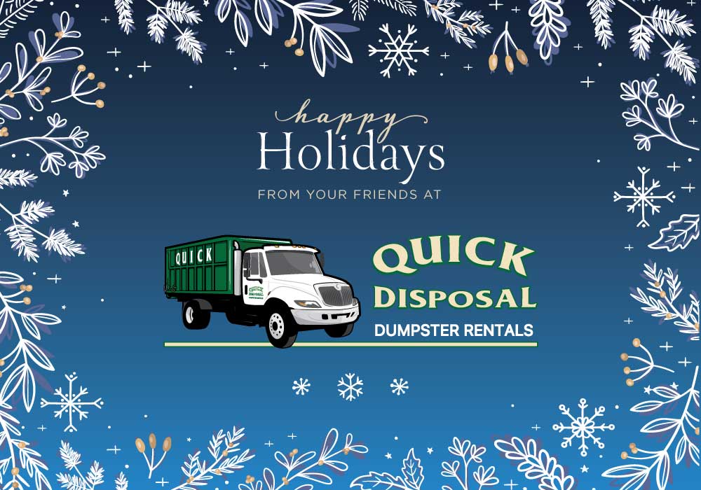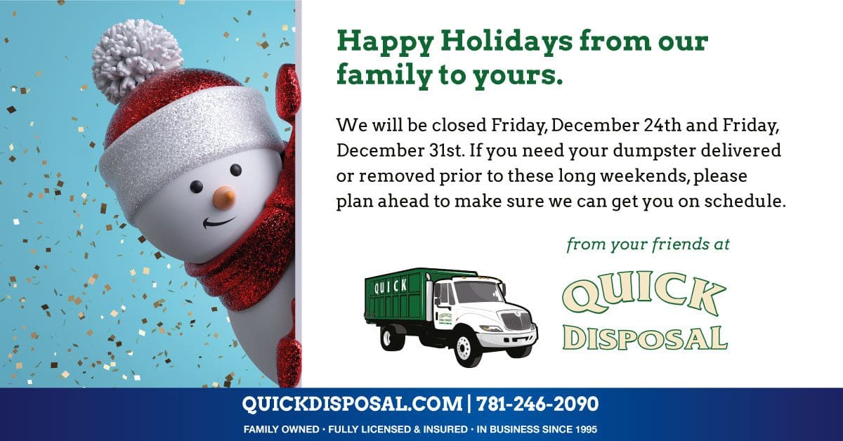 We will be closed Friday, December 24th and Friday, December 31st. If you need your dumpster delivered or removed prior to these long weekends, please plan ahead to make sure we can get you on schedule.